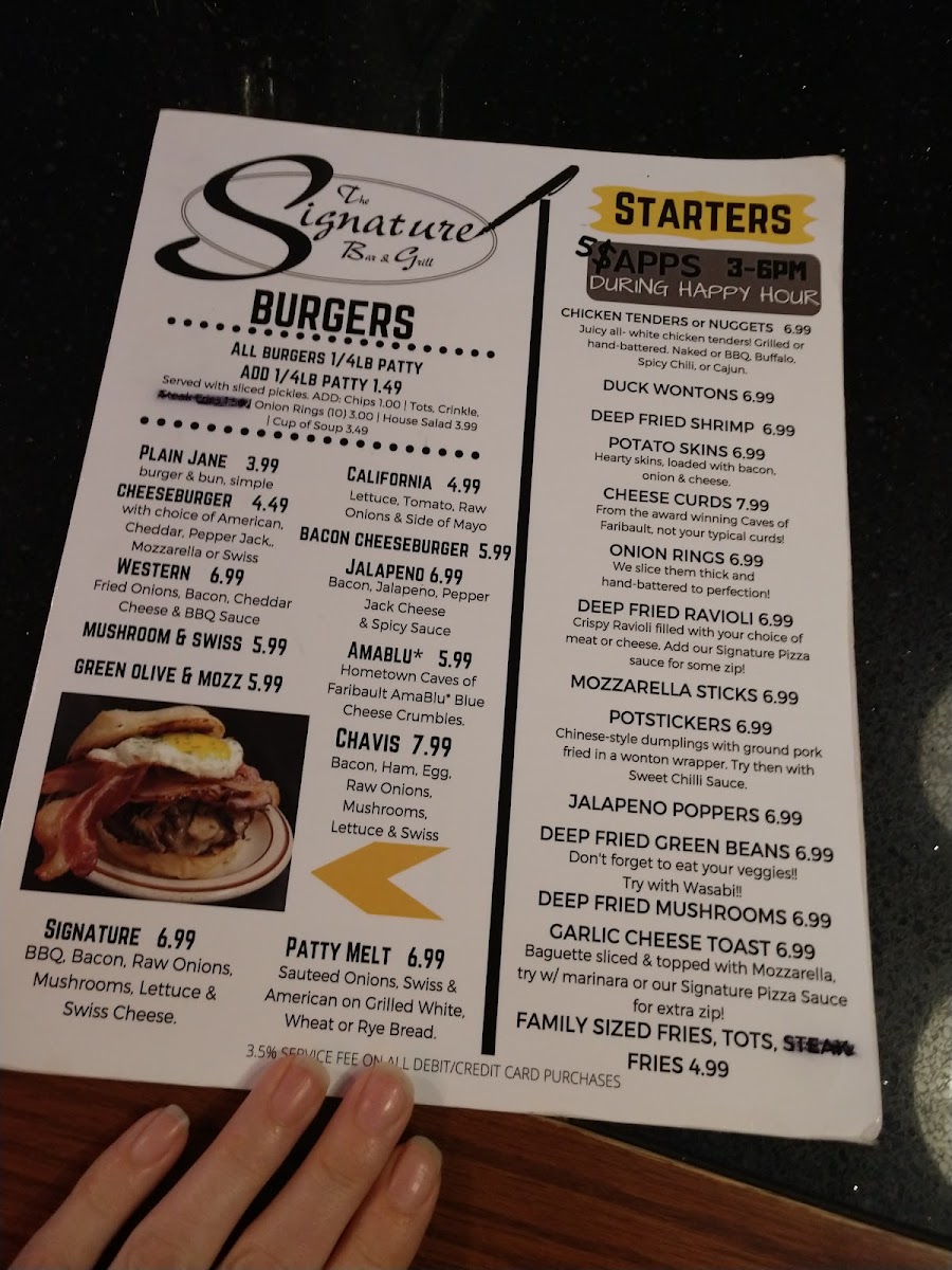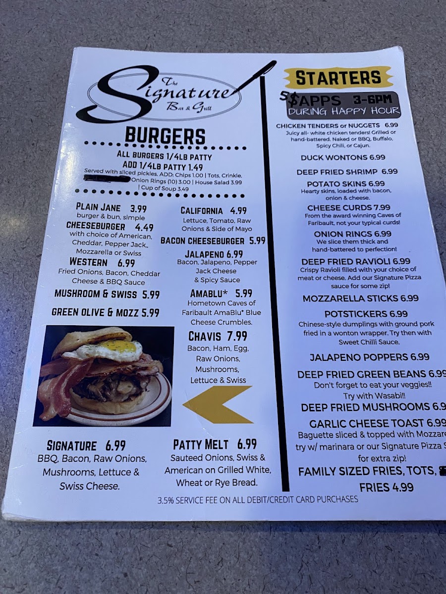 Welcome to The Signature Bar and Grill, a vibrant dining destination nestled at 201 Central Ave N in Faribault, MN. Here, you will discover a menu that celebrates comfort and flavor, featuring an array of delectable choices that cater to every palate.